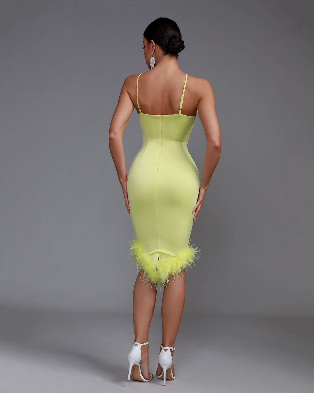 This Asymmetric Neckline Feather Trim Midi Dress is designed for a sophisticated, exclusive look. Crafted from luxurious material, its asymmetric neckline is perfectly detailed with feather trim that captures light and adds a touch of distinctive elegance. The dress is perfect for any night out and will be sure to turn heads.