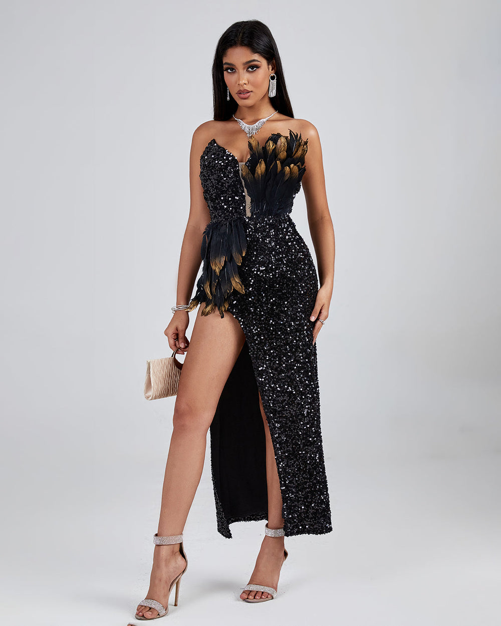 This Asymmetric Sequin Embellished Feather Dress is crafted from a mix of feathers and sequins to create an eye-catching design. Its asymmetrical cut gives it a unique look that is sure to make a statement. The feather details lend a softness and lightness to the dress, while the sequin embellishment brings a touch of sparkle. Perfect for special occasions.