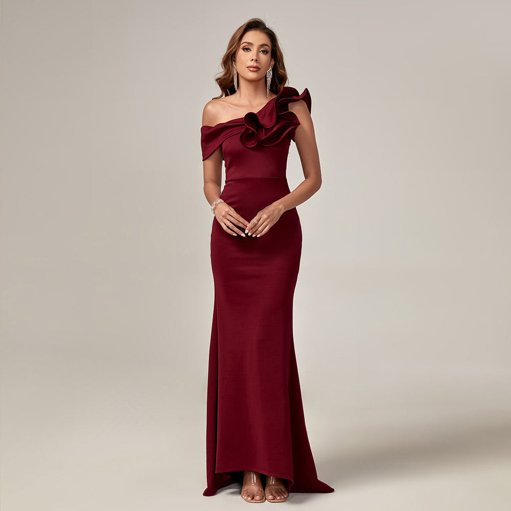 Our Asymmetrical Neck Ruffle Trim Prom Dress features an elegant design with an asymmetrical neckline and ruffle trim for a classic, sophisticated look. Perfect for formal events, this dress will make you shine.