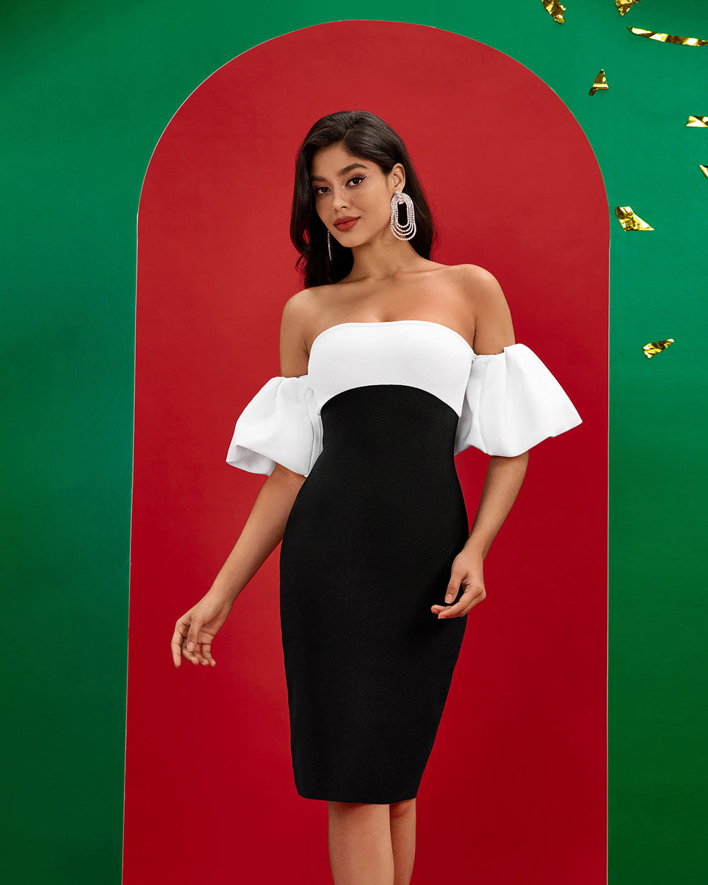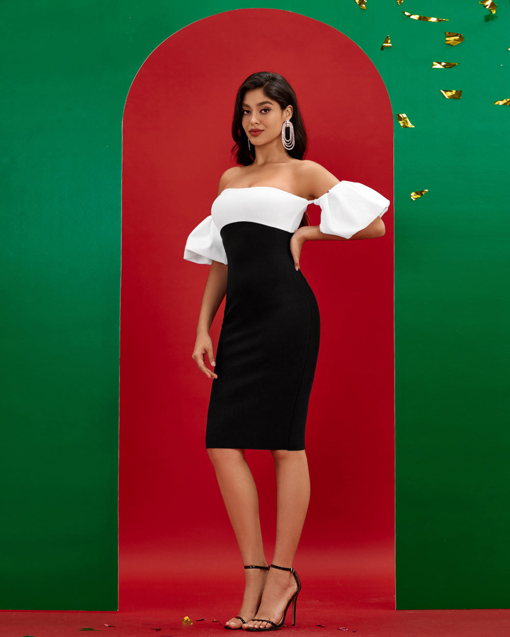 Achieve a stunning look with this Black white Off Shoulder Bandage Dress. The statement making design features an off-shoulder silhouette, giving this dress a modern and sophisticated edge. The body hugging fit and bandage material ensures a flattering and comforting fit. Perfect for any occasion, this dress is sure to make you stand out in style.