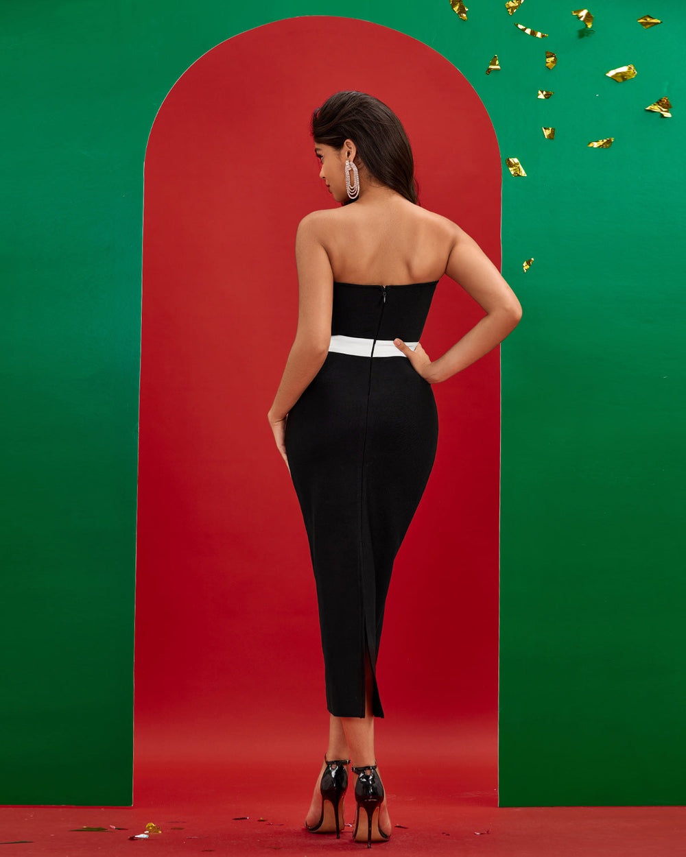 Striking a classic balance with shimmering black and white, this elegant bandage dress is sure to make a statement. Crafted from sleek materials that will hug your figure in all the right places, the Midi length and strapless silhouette combine to create a timelessly sophisticated look. Make a bold impression with this luxurious piece.