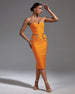 Make a statement in this Chain Detail Cut Out Midi Bandage Dress. Show off your curves in a midi-length bandage dress detailed with golden chain accents for an edgy and glamorous look. Make it yours and turn heads everywhere you go!