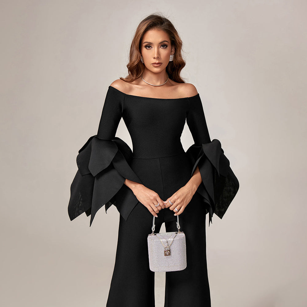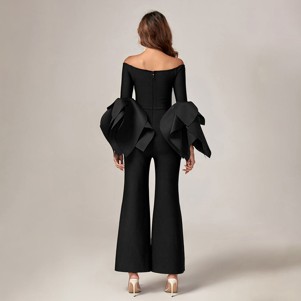 This Dramatic-Sleeve Off Shoulder Bandage Jumpsuit features voluminous sleeves and a body-hugging fit for an eye-catching look. Its lightweight nylon-spandex blend offers comfort and flexibility for all types of activities. Perfect for special occasions and everyday wear.