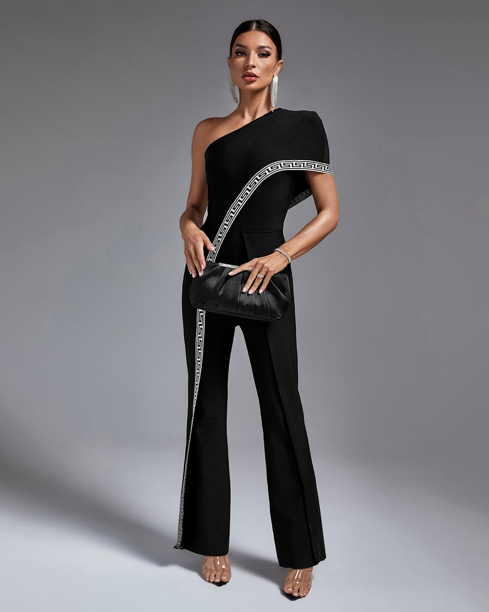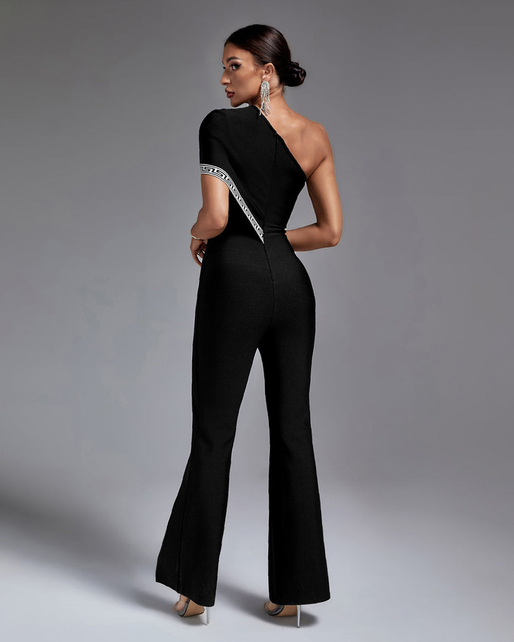 Unveil your inner goddess with this exquisite, one-shoulder bandage jumpsuit. Crafted from the finest materials with sophisticated style and luxurious detailing, this statement piece is sure to captivate any room. Celebrate the beauty of femininity with the stunning elegance of this garment.