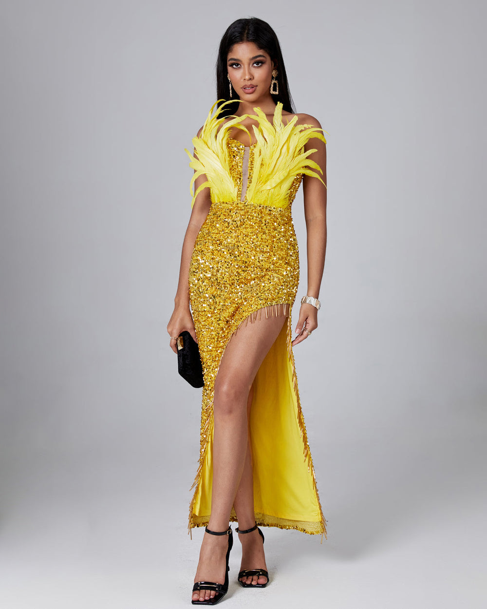 Capture the room's attention with this luxurious Feather Sequin Maxi Dress. With its delicate feather sequins, this ethereal dress is perfect for any special event or occasion. Make a bold statement in this exquisite showstopper and be remembered. Shine bright!