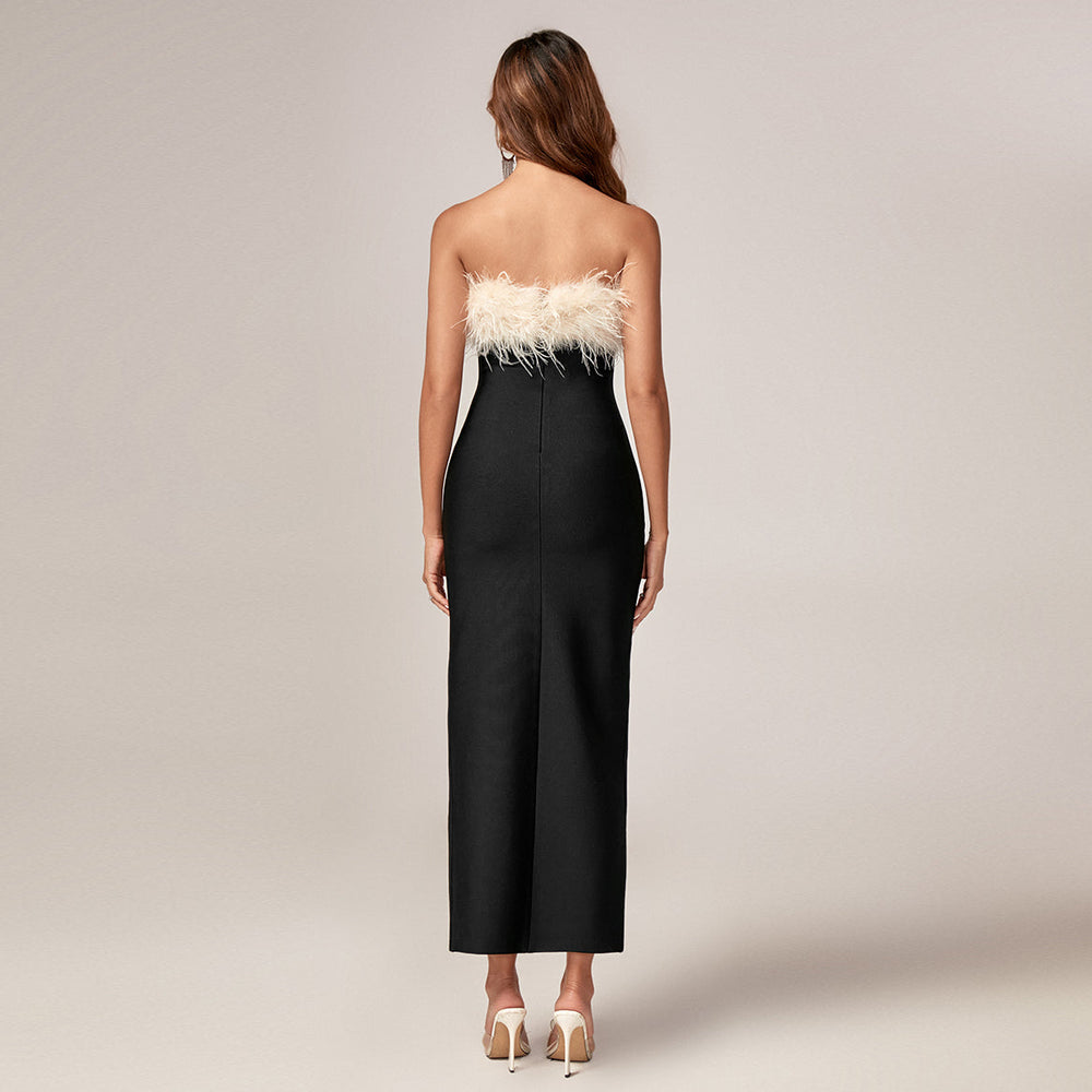 You'll turn heads in this Feather Trim High Slit Bandage Cocktail Dress. Made of bandage fabric, it hugs your curves while providing a stretchy but structured fit. The high slit allows you to show some leg while the feathers bring an unexpected and unique touch. Perfect for any special occasion.