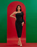 Luxuriate in this elegant one-shoulder midi dress boasting refined feather detailing and a classic bandage silhouette. This timeless piece is perfect for special occasions, delivering effortless sophistication and timeless beauty. Perfect for any modern woman who desires to make a statement in style.