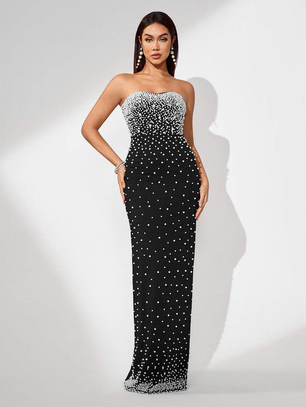 The Graceful Pearl Embellished Backless Dress features modern details and a flattering silhouette, elevating your look for red dresses for women.