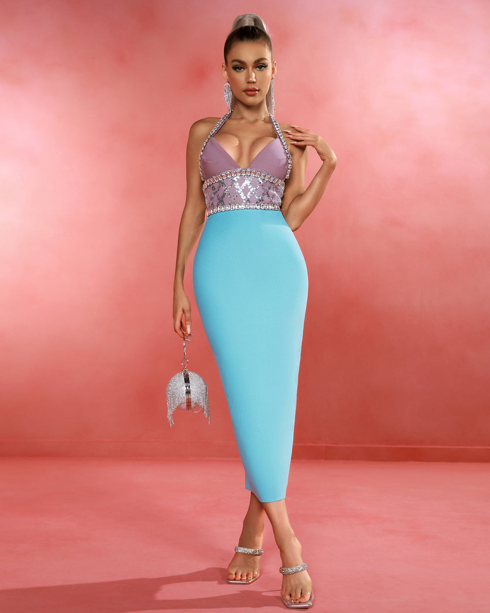 Get ready to make a statement with the Halter Sleeveless Sequins Midi Bandage dress! Featuring a stunningly elegant halter neckline that shimmers with delicate sequins, this midi dress is perfect for making a lasting impression at any occasion.