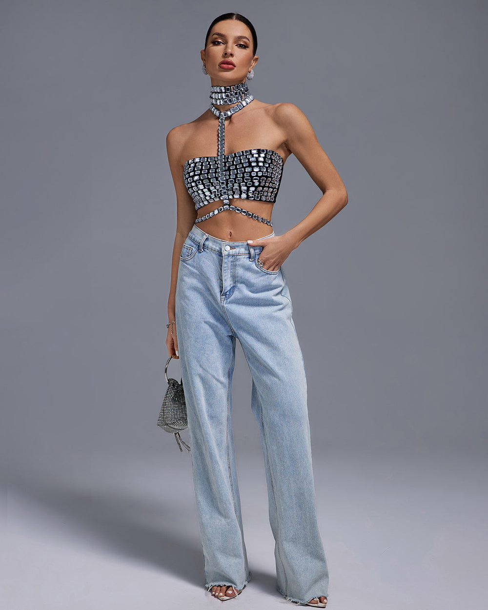 Get ready to turn heads with our Halter Rhinestone Bandage Top! The halter neckline and rhinestone detailing add a touch of glamour to this figure flattering top. Perfect for a night out or special occasion, it's the perfect piece to elevate any outfit.