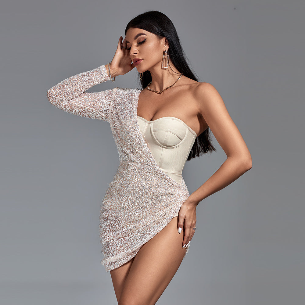 Luxuriate in this exquisite sequined draped one sleeve bustier dress. The perfect garment for any special occasion, you will love the luxurious sparkle of this elegant design that is sure to turn heads. Made with a delicate blend of fabrics for a soft, smooth fit and feel, this bustier dress will make you stand out in any crowd.