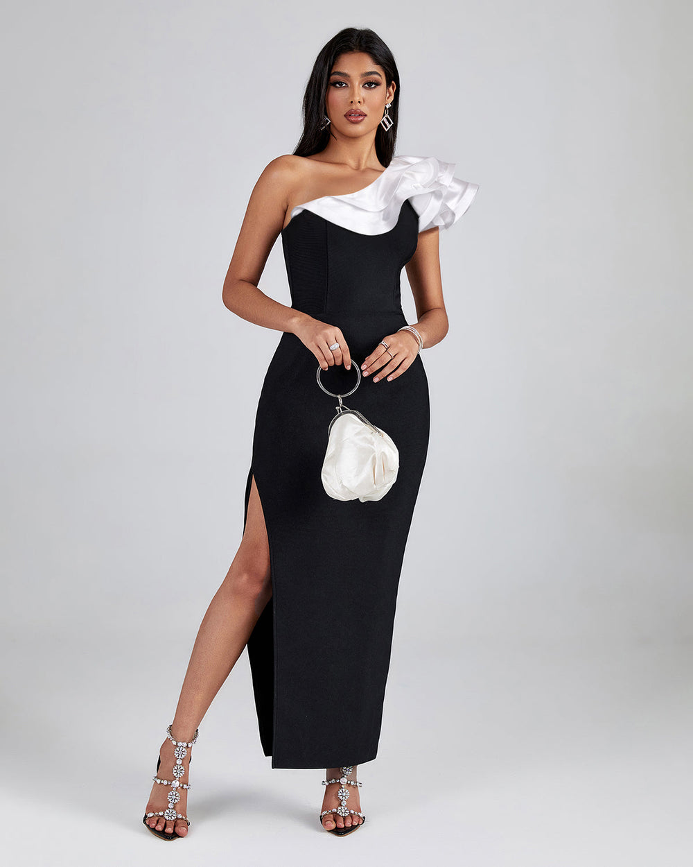 Our Irregular Ruffled Side Slit Bandage Dress exudes timeless elegance and luxury. Crafted with intricate detail, the delicate ruffle pattern drapes elegantly over the body, while the side slit adds a hint of sophistication. Step out in style in this luxurious, exclusive dress that will make you feel like a fashion icon.
