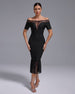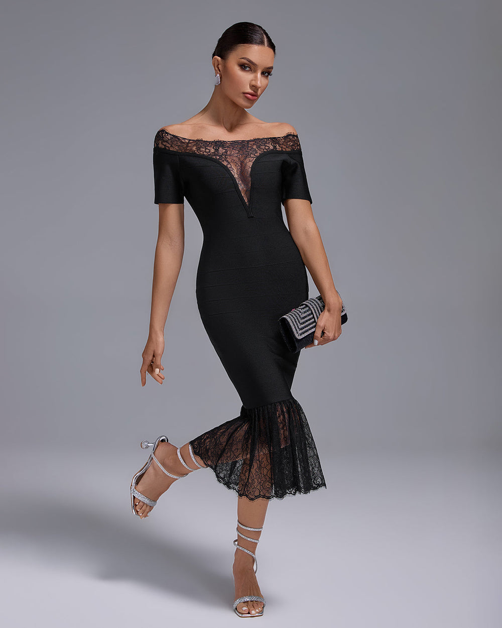 Show off your feminine style with our Off Shoulder Bandage Midi Lace Dress! The form fitting bandage fabric hugs your curves, while the elegant off shoulder design adds a touch of romance. The delicate lace detail adds a touch of allure, making this dress perfect for any special occasion.