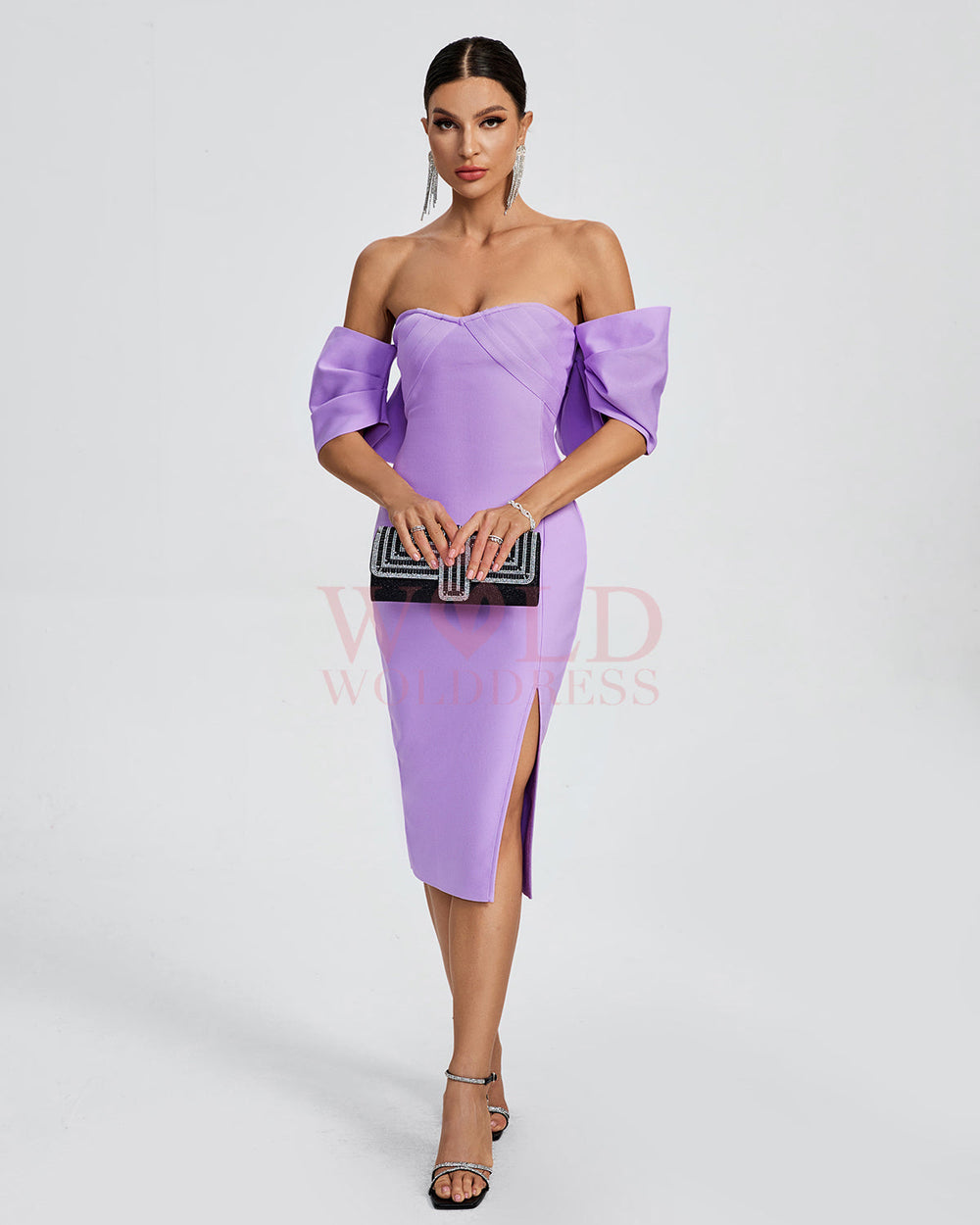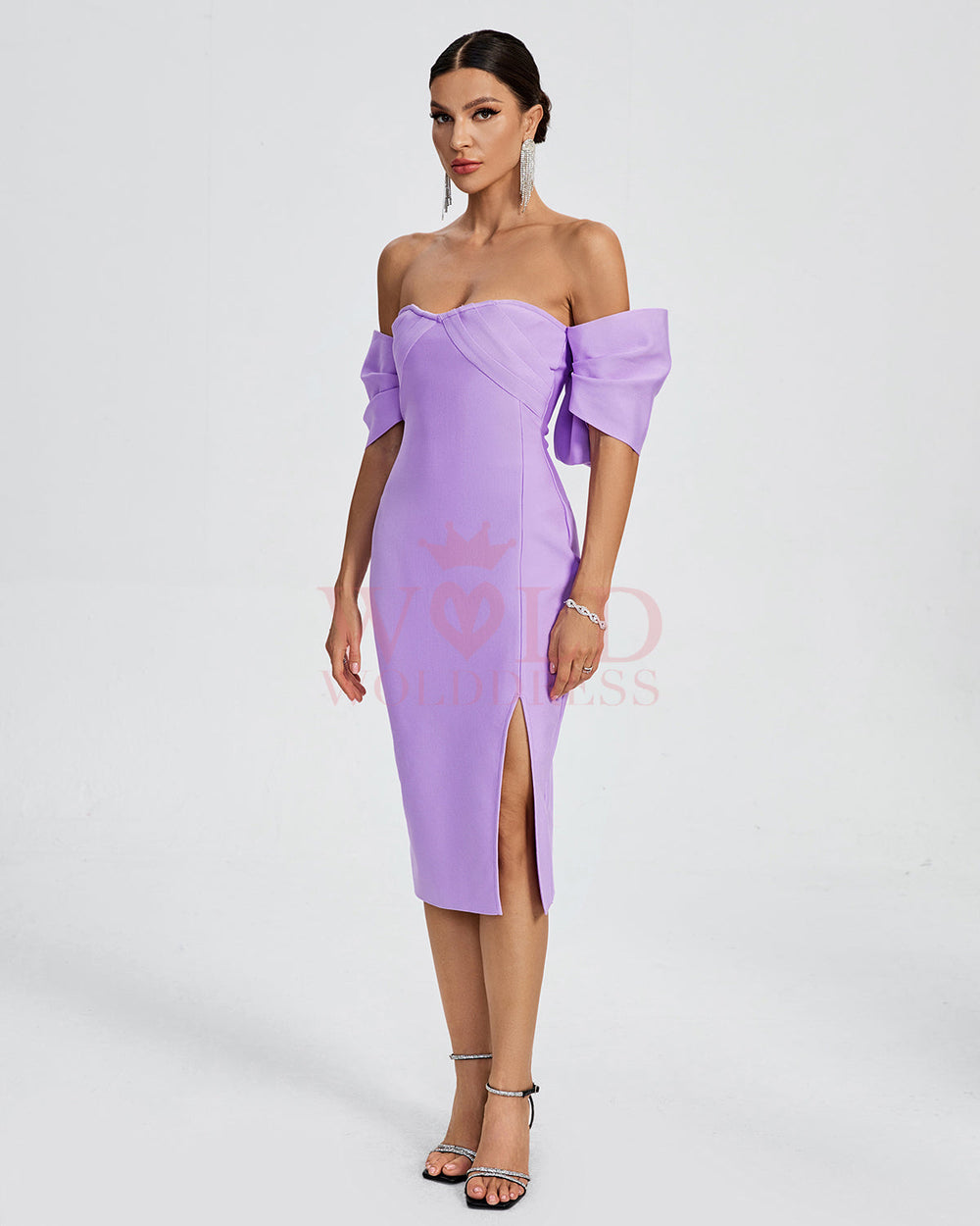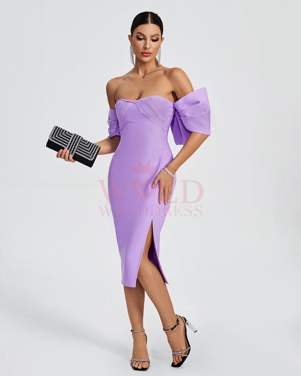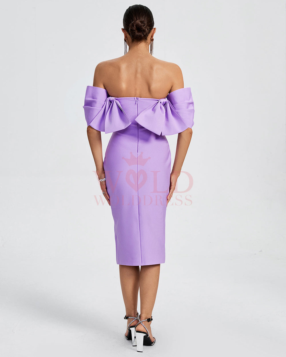 Be the center of attention in our Off Shoulder Bow-Detail Midi Bandage Dress. The vibrant purple color and tasteful side slit will have all eyes on you. The off shoulder neckline with bow detail adds a touch of feminine charm. Perfect for making a statement at any event.