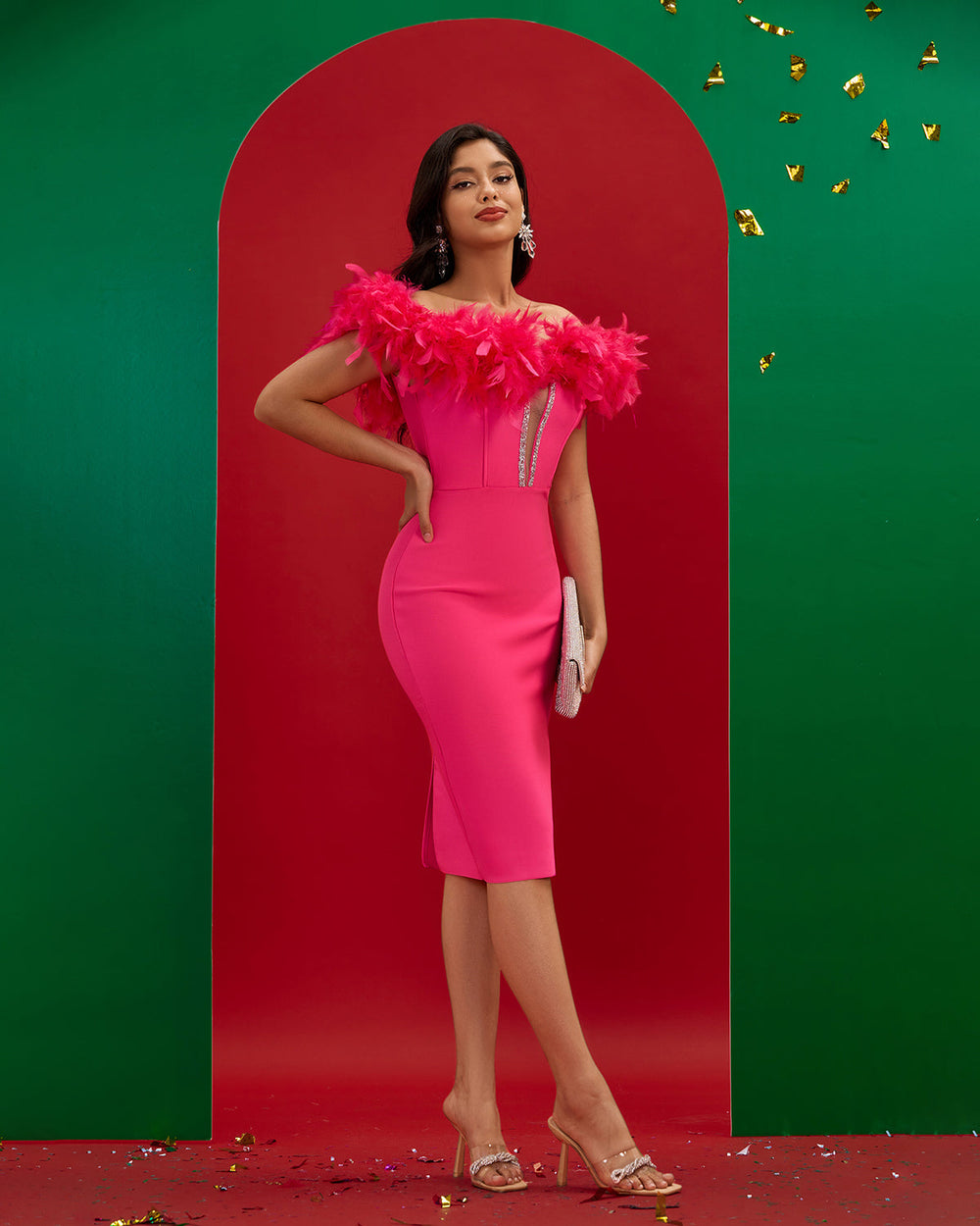 Experience the ultimate statement piece with this Off Shoulder Feather Trim Bandage Dress. Crafted from premium fabrics to ensure a luxurious feel, this dress features a contemporary off-shoulder design and intricate feather trim. Turn heads in this timelessly elegant dress, designed for the modern woman.
