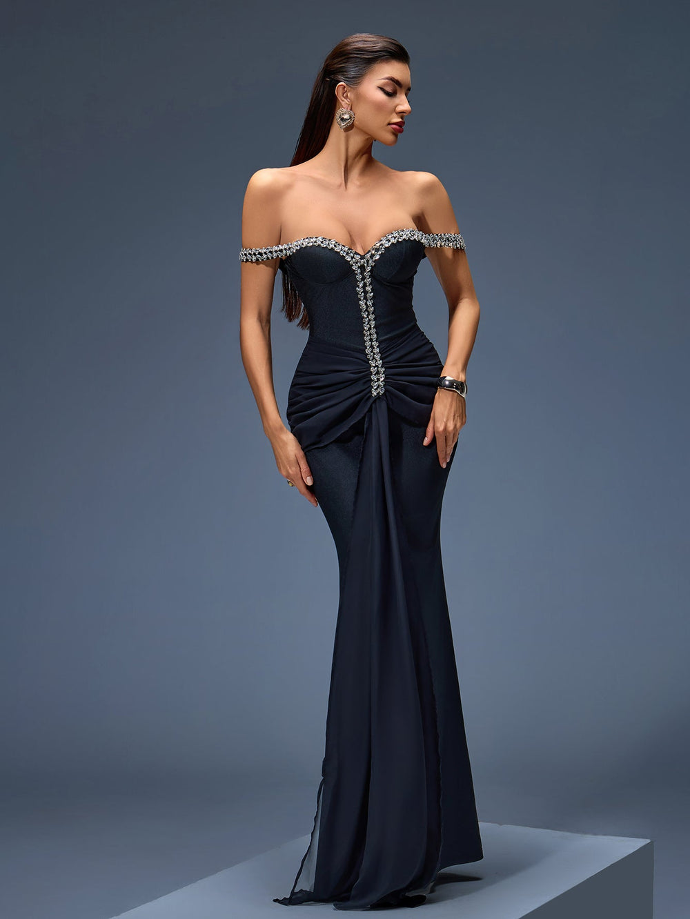 The off-shoulder neckline and rhinestone mesh add sparkle and allure to this maxi dress, ideal for formal dresses for women who love a touch of glam.