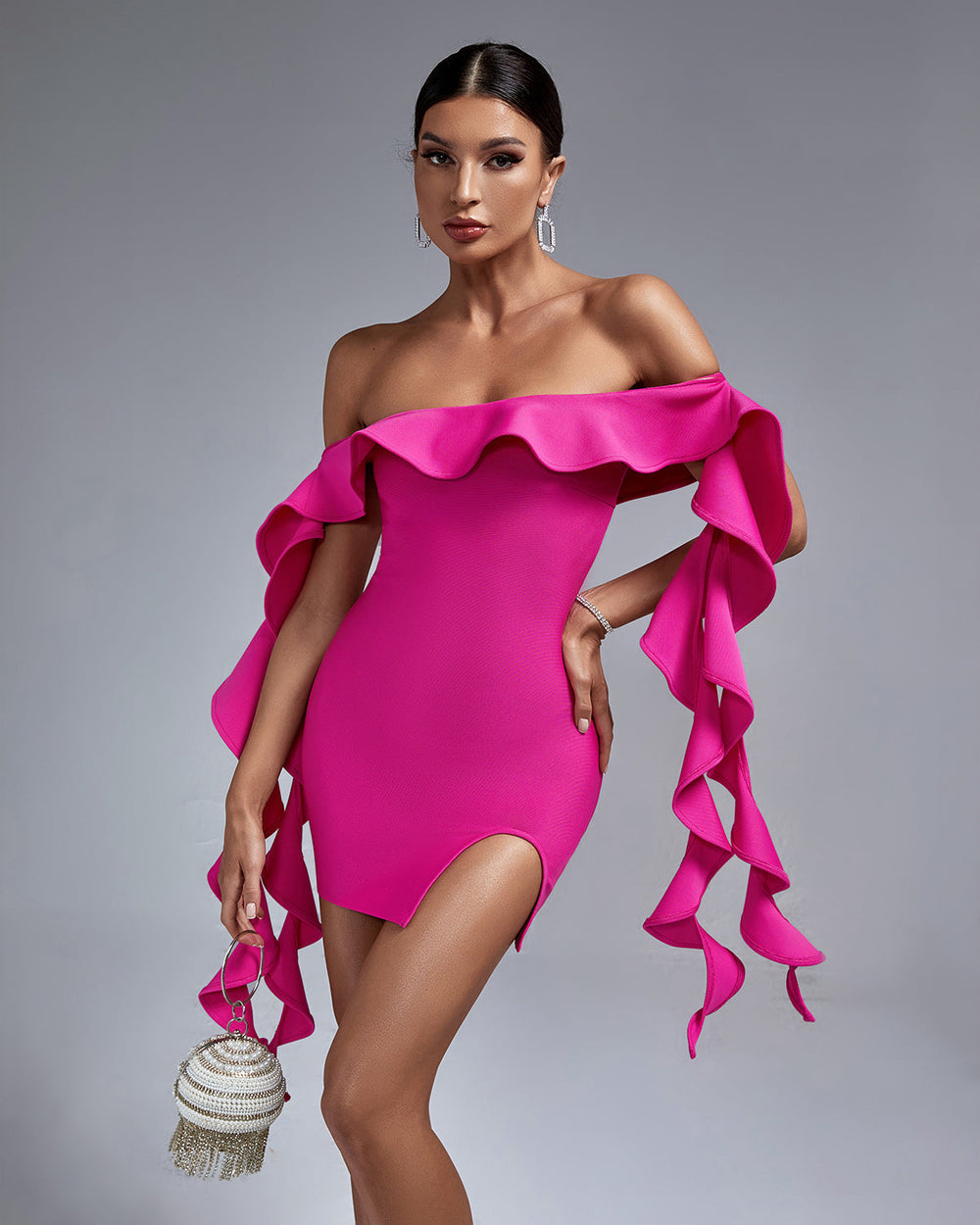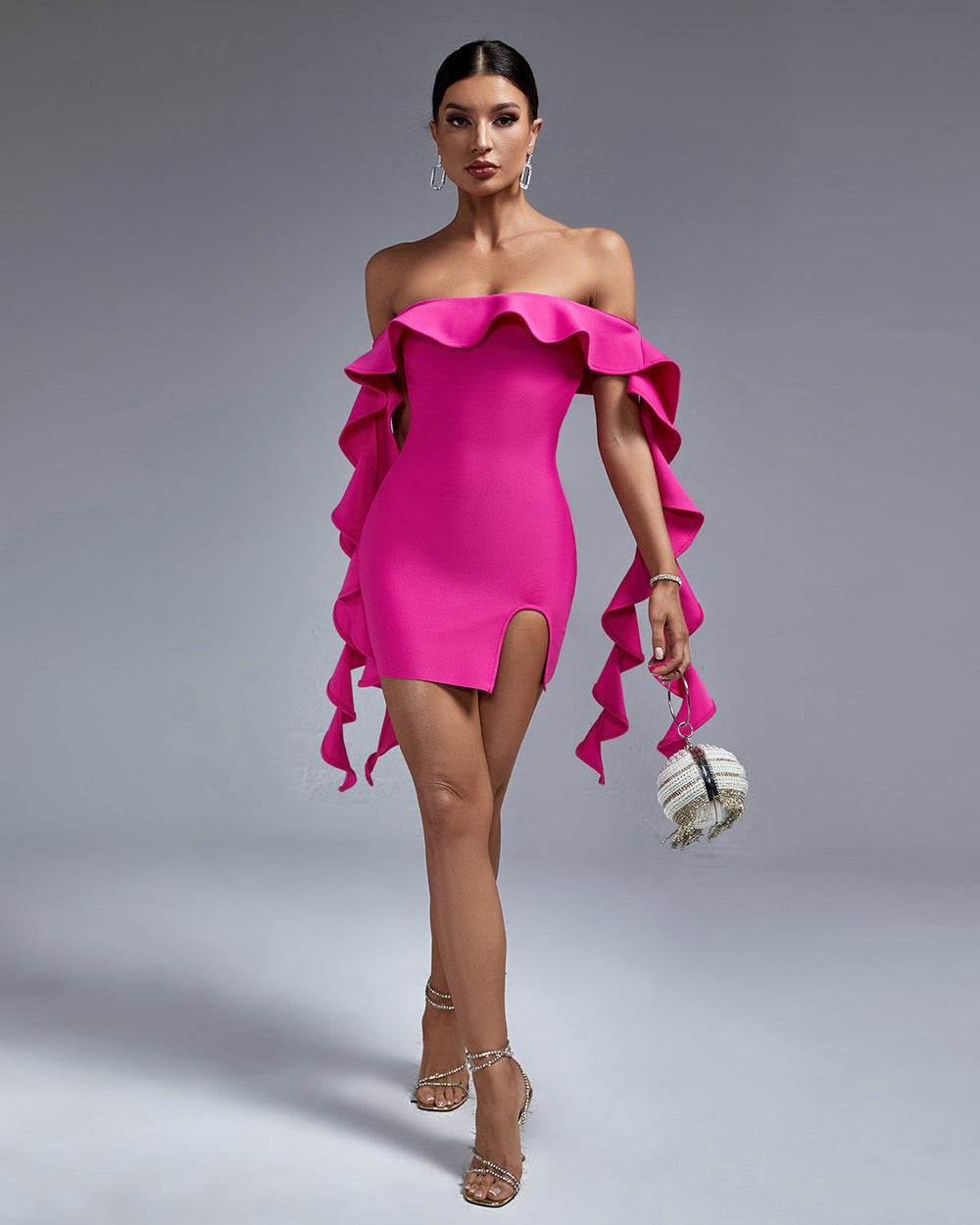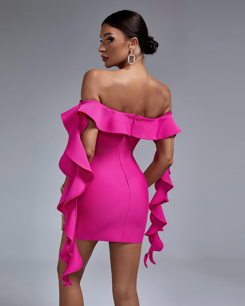 Elevate your style with this Off Shoulder Ruffle Mini Bandage Dress. Made with a specialized mix of lightweight materials, the dress is designed for optimal comfort and ease of movement. Its off shoulder ruffle finish offers a timelessly elegant look, that will look great on any body type.