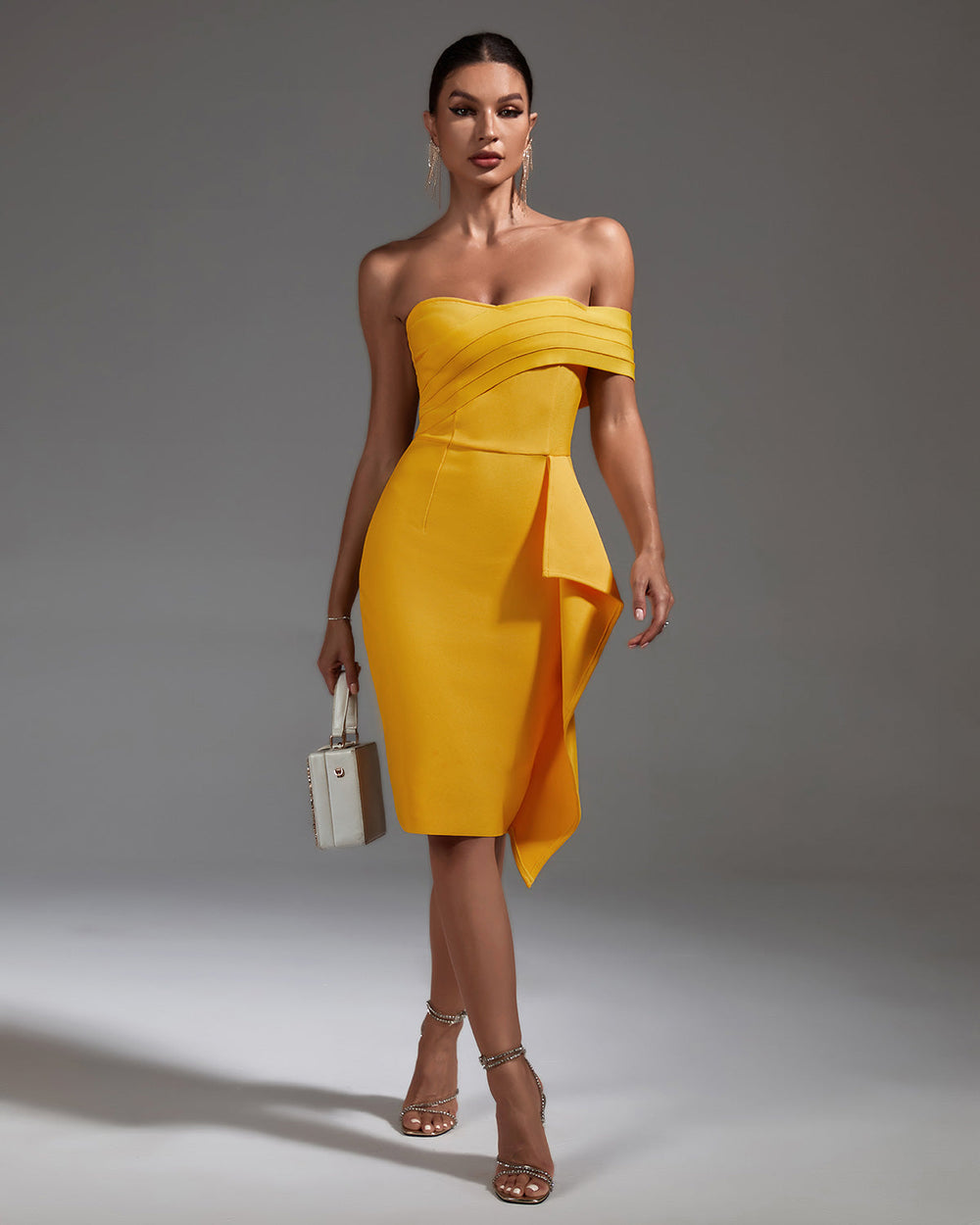 Our Off Shoulder Ruffled Midi Bandage Dress is a luxurious choice for a special event. This elegant piece features a slim silhouette, gathered ruffle details, and an off-shoulder design that creates a timeless look. Perfect for any season, its flattering shape and distinctive silhouette ensure all eyes will be on you.