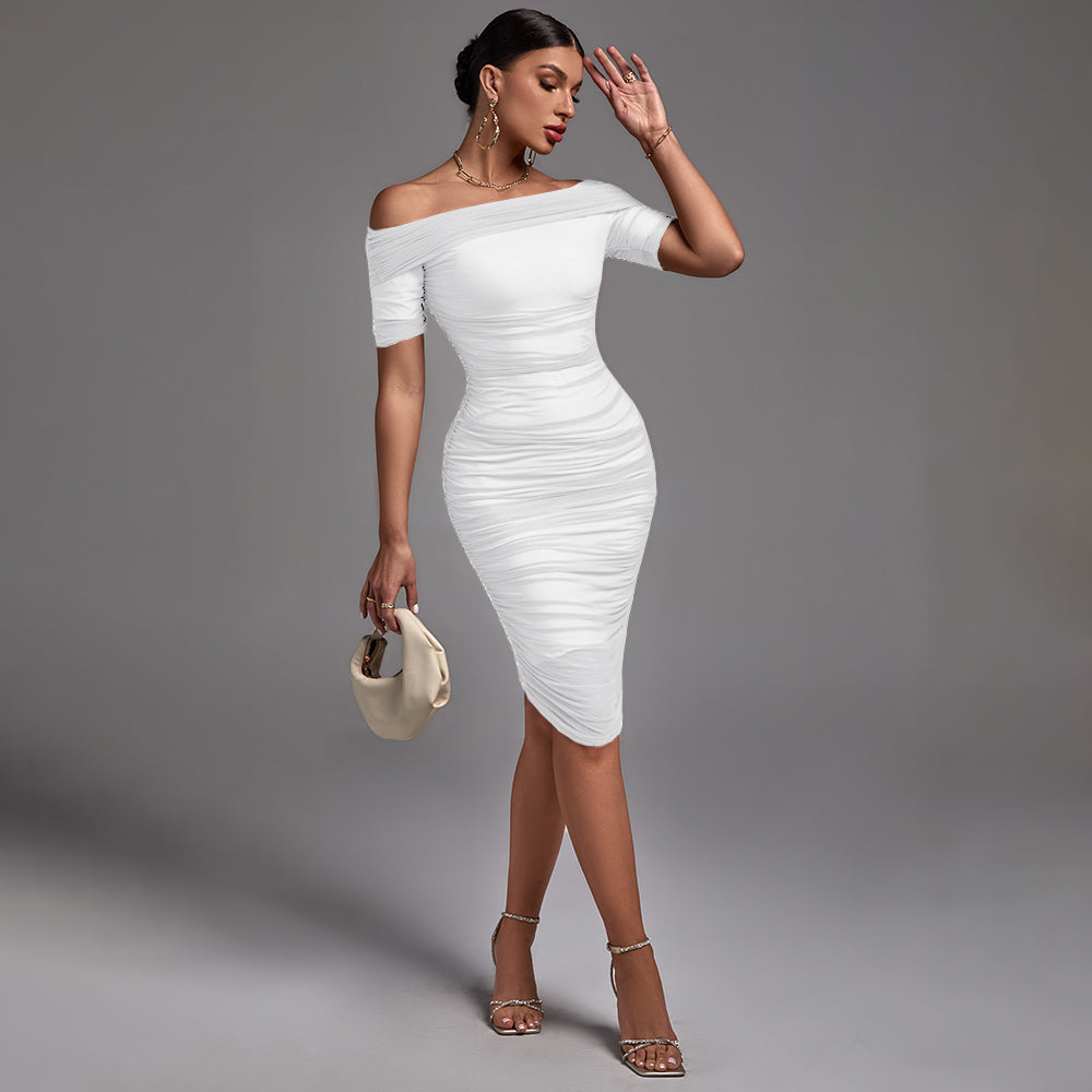 Dare to stand out with this Off Shoulder Short Sleeve Ruched Midi Bodycon Dress. Its unique design will power up your confidence and make you look and feel extraordinary. Now's the time to dominate the occasion. Beat the odds and make a statement!