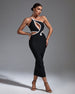Unleash your wild side in this daring one shoulder cutout midi bandage dress! With its daring length and statement cut-out shoulder, this dress will have you fiercely turning heads. Get ready to be the centre of attention!