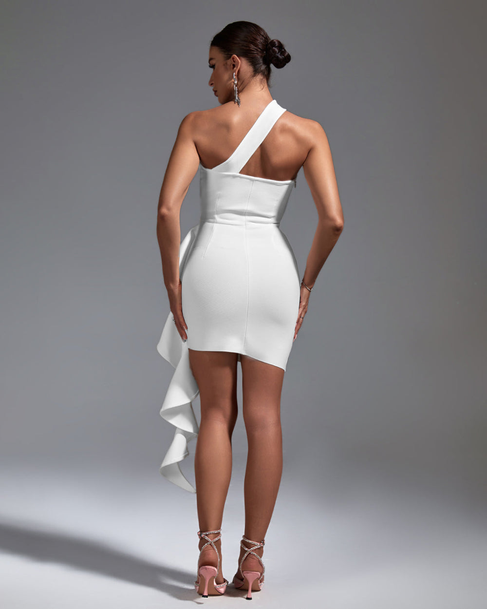 Introduce yourself to timeless elegance in this One Shoulder Draped Mini Bandage Dress. Crafted with figure-hugging bandage material, this piece is certain to be the pinnacle of your wardrobe, radiating an aura of sophistication and sophistication that will transform you into modern royalty.