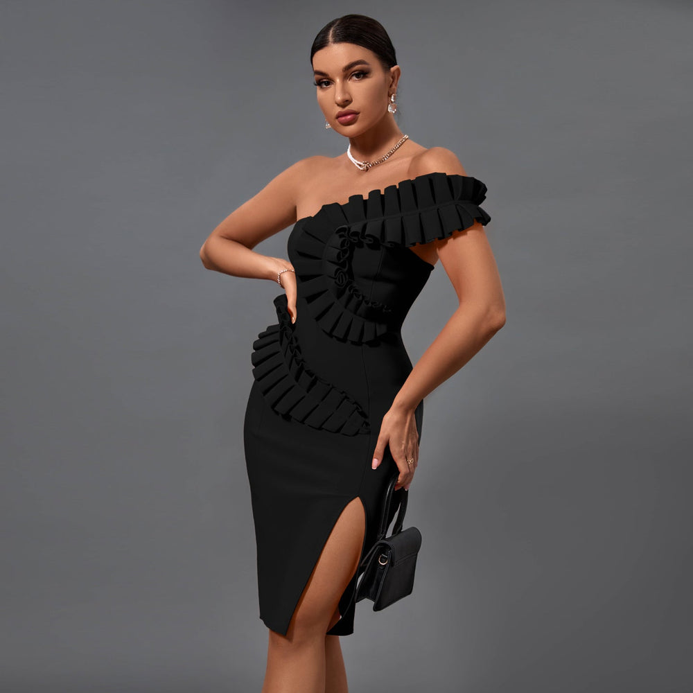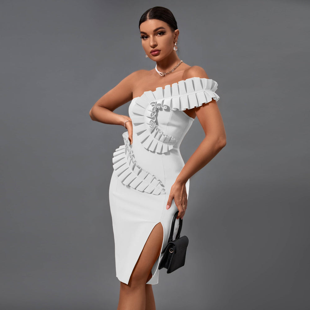 This classic one shoulder dress is perfect for special occasions. The embellishments add a subtle elegance to the bandage dress, making it the ideal choice for any formal event. With a comfortable fit and beautiful detail, you'll shine in this amazing dress.