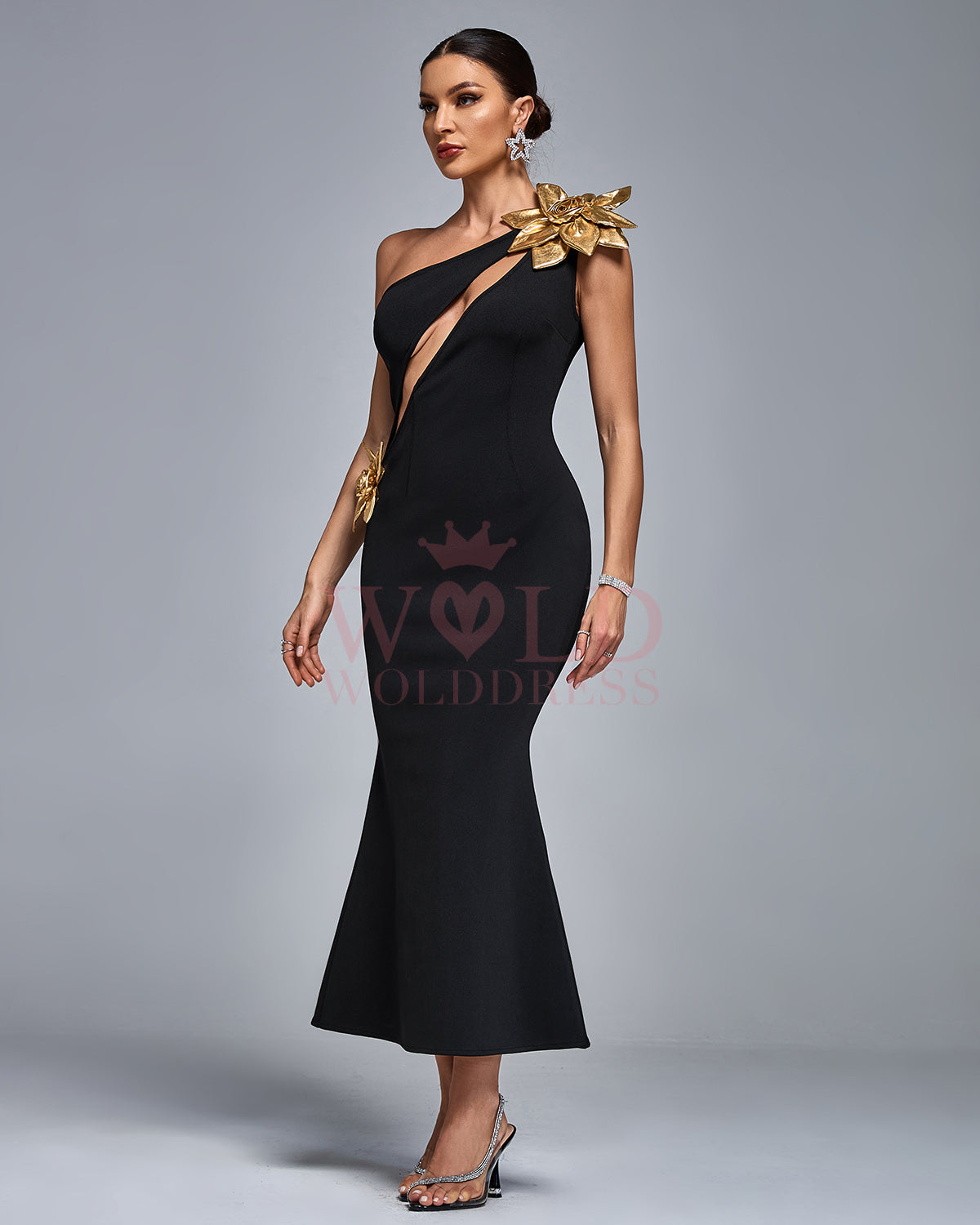 One Shoulder Gold Flower Cut Out Bandage Dress
