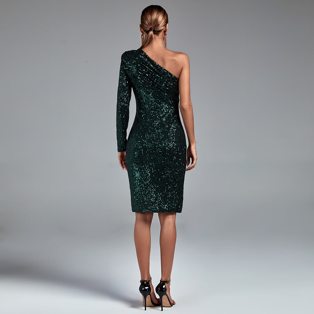 Be daring and stand out in this stunning one-shoulder asymmetrical dress! Adorned with shining sequins, the dress makes a bold statement that will turn heads and have everyone mesmerized. Make an unforgettable entrance and show off your unique style!