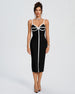 This White-Stripe Midi Bandage Dress exudes elegance with its black line details, sensual V-neck, and exposed back. The sophisticated silhouette and double straps make it a must-have for any exclusive occasion. Elevate your style with this luxurious and figure-hugging dress.