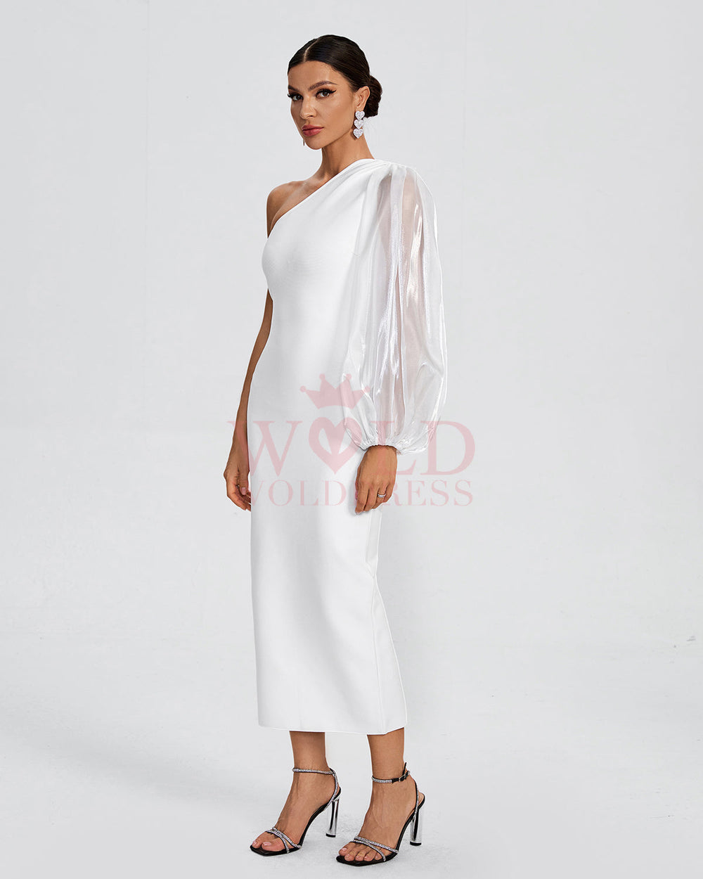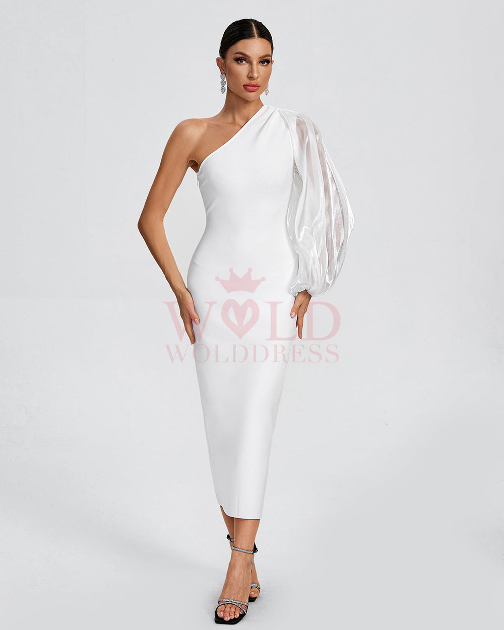 Introducing our One Shoulder Bishop Sleeve Bandage Dress. This stunning pure white dress exudes sensuality and elegance. Its one shoulder design and bishop sleeves add a touch of sophistication, making it the perfect choice for any special occasion. Elevate your style with this luxurious and exclusive dress.