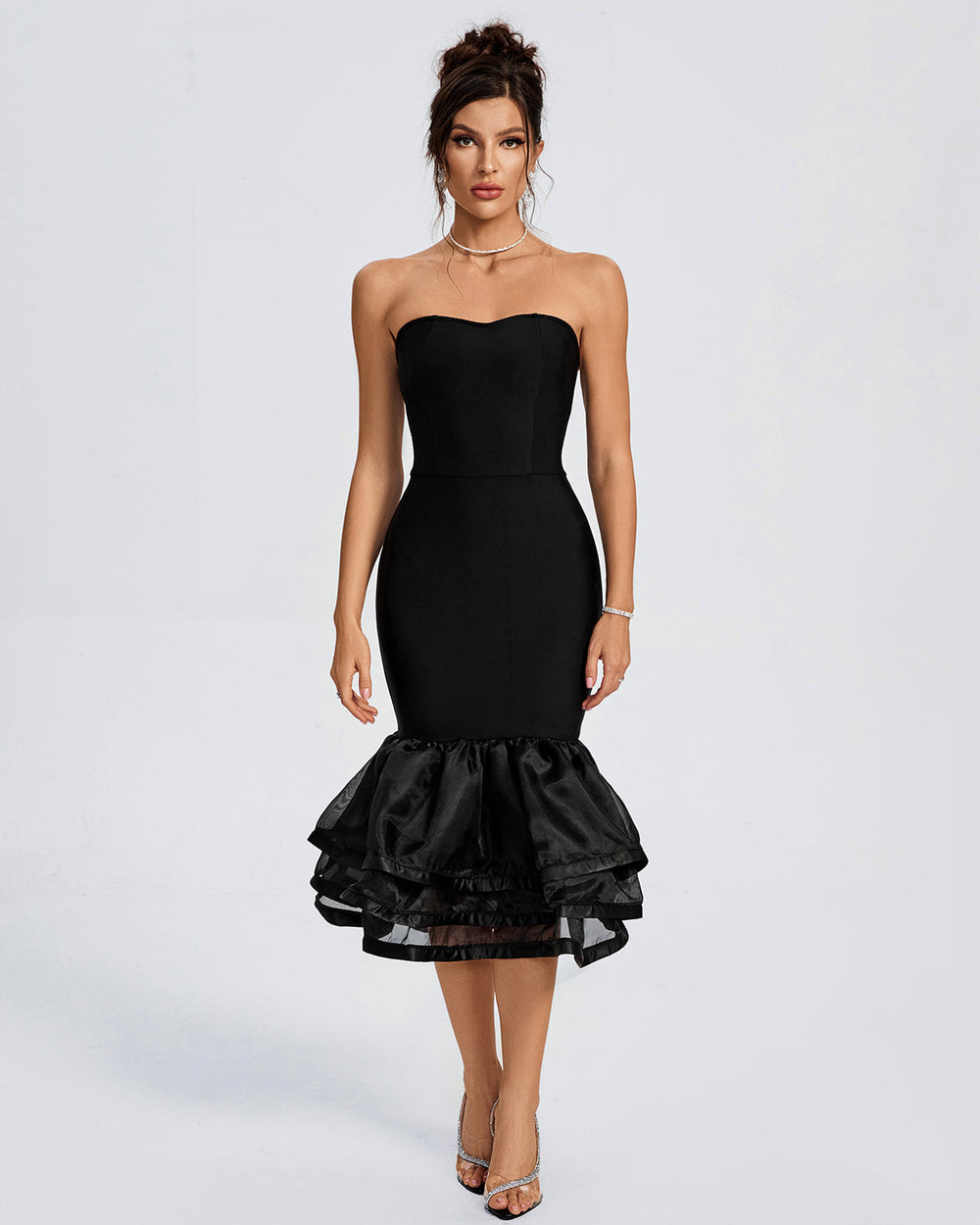 Introducing our Strapless Tiered Ruffle Hem Bandage Dress, the perfect combination of style and sophistication. This dress features a strapless design and a tiered ruffle hem that will make you stand out from the crowd. The voluminous lower half adds a romantic and elegant touch to this premium dress.