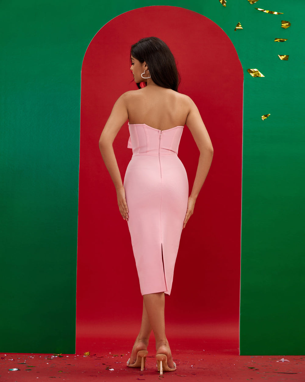 Luxuriate in this limited-edition Pink Bowknot Bandage Bustier Dress, crafted with an exquisite pink hue and a bandage bustier design for a touch of opulence. Delicate bows add a hint of whimsy to an elegant look that celebrates your femininity.