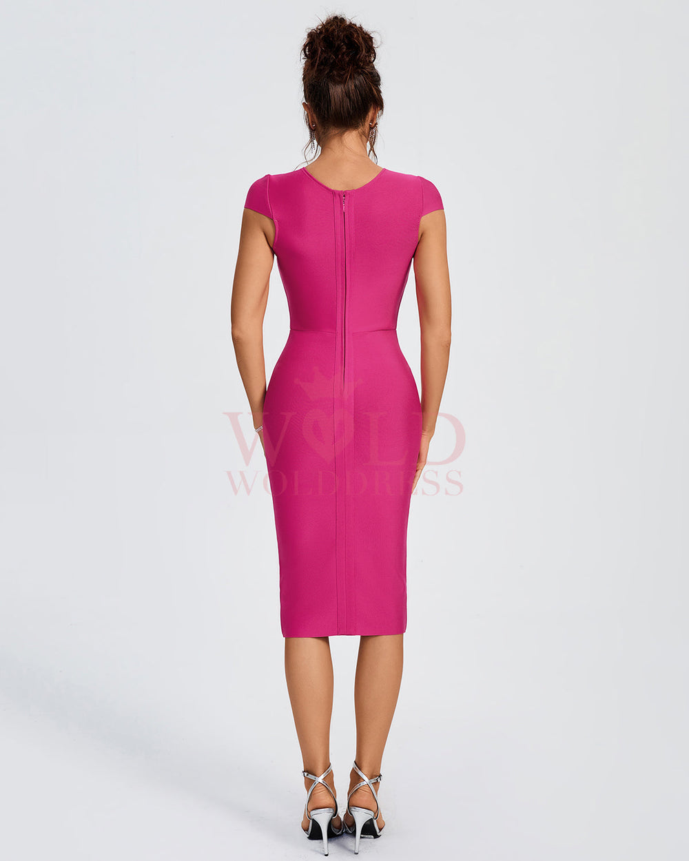 This V neck cutout midi bandage dress in a luxurious rose red color features elegant and tasteful side cutouts. Its sophisticated and exclusive design is perfect for making a statement at any event. The perfect blend of art and fashion.