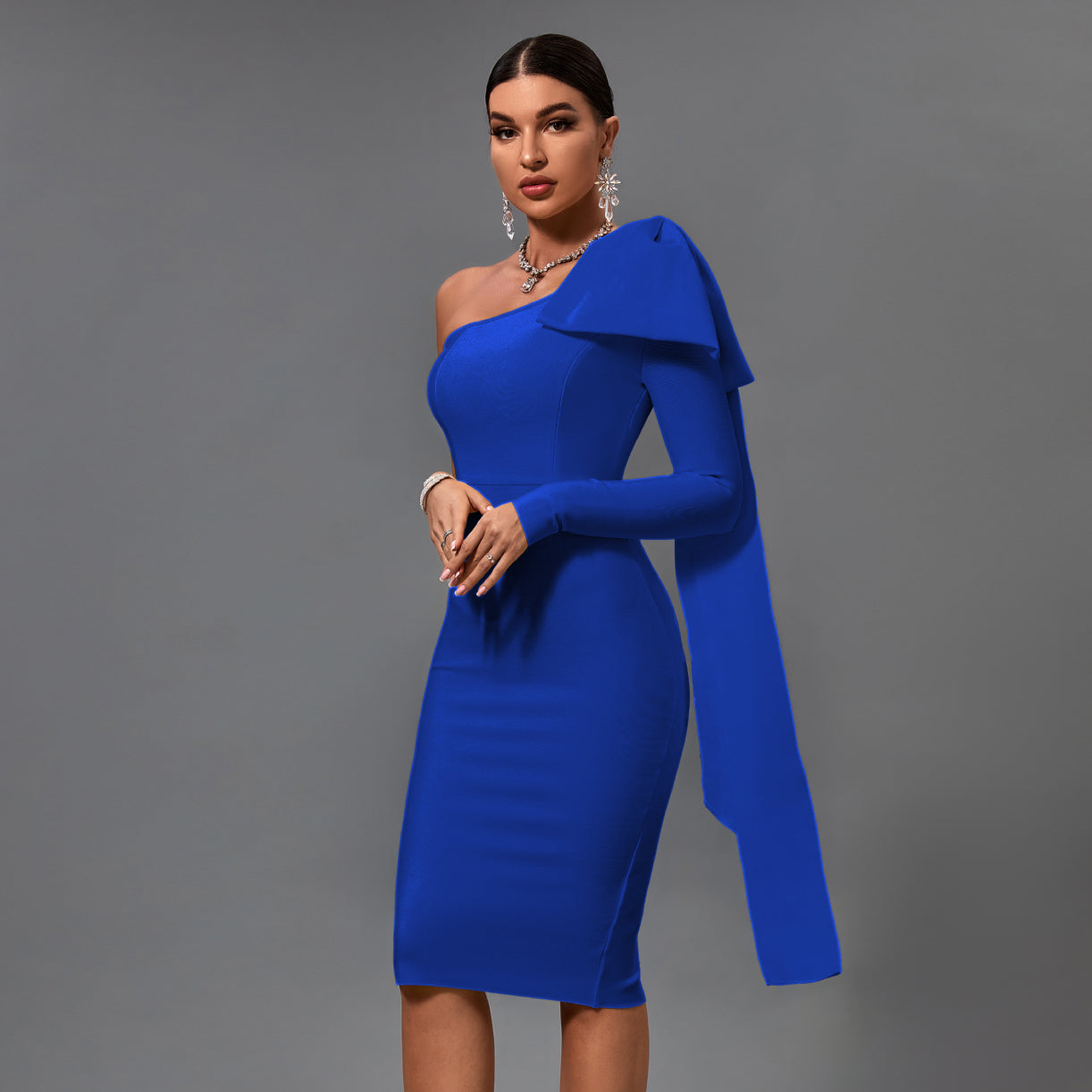Take a risk with this daring Asymmetrical Bowknot Midi Bandage Dress. Both stylish and provocative, the asymmetrical cut and bowknot details will leave you feeling confident and bold. Push boundaries and show off your unique style with this one-of-a-kind statement piece!