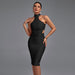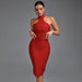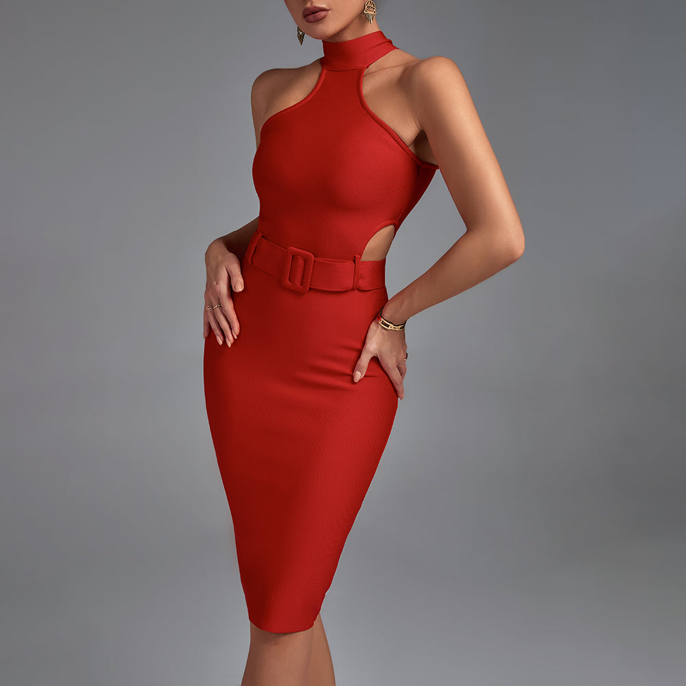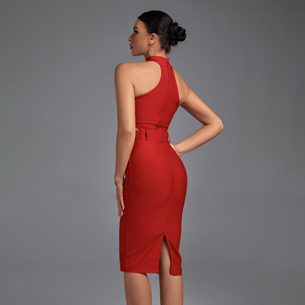 Make a statement in this sophisticated High Neck Sleeveless Cut Out With Belt Bandage Dress. This chic number features a stunning cut out with a designer belt, perfect for pairing with heels to create a timeless, exclusive look. With its understated yet eye-catching silhouette, this dress is sure to elevate any wardrobe.