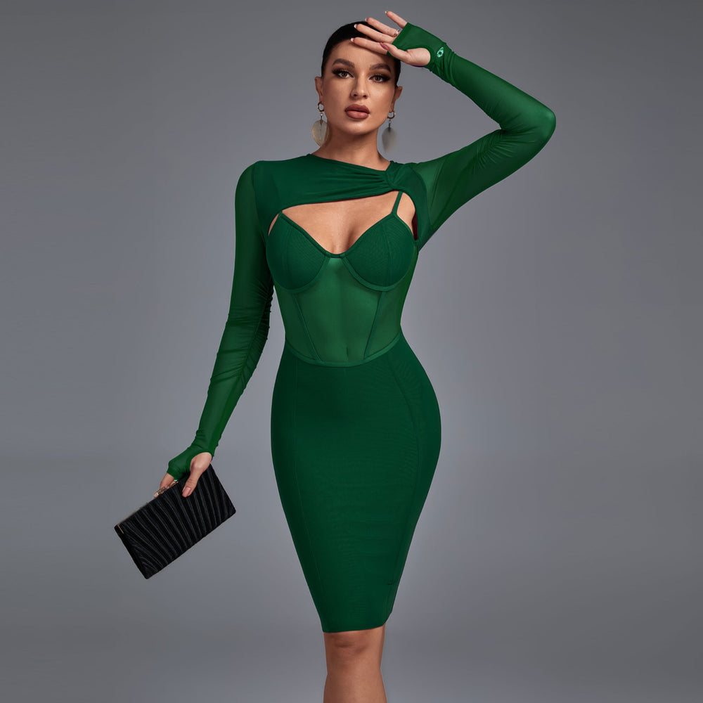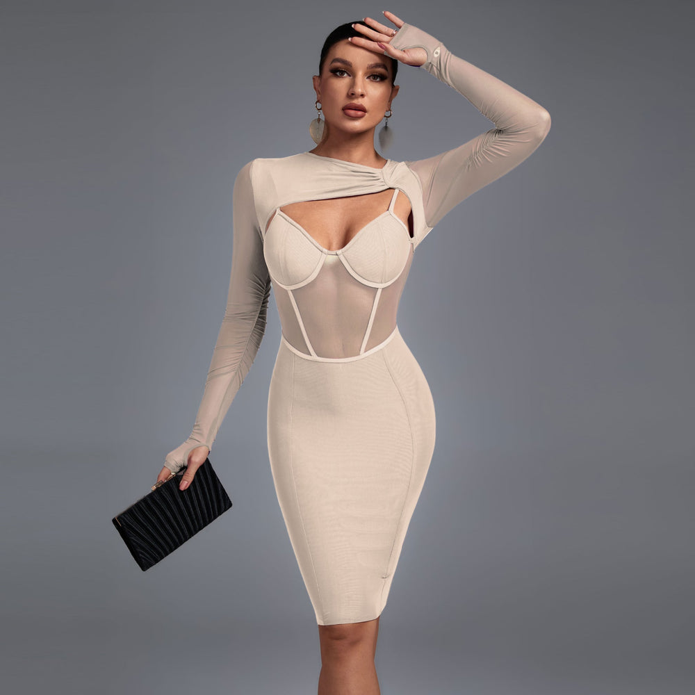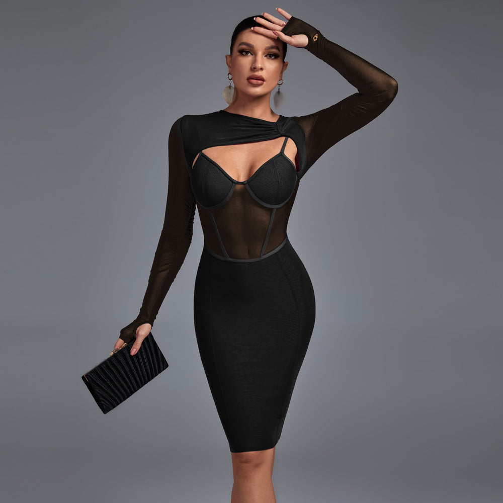 Look stunning and feel comfortable in this Long Sleeve Cut Out Mesh Bandage Dress. Crafted with high-quality bandage fabric and mesh material, this dress is perfect to wear for any special occasion. With its tailored fit and long sleeve design, you'll be sure to turn heads in this must-have dress.