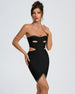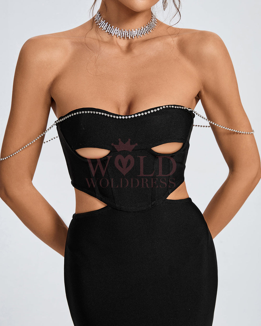 Indulge in luxury with our Crystal Chain Cutout Mini Bandage Dress. The intricate black cutout design and low-cut neckline exude sophistication. Adorned with crystal chains, this dress will make a statement at any special occasion. Elevate your style and stand out with this exclusive piece.