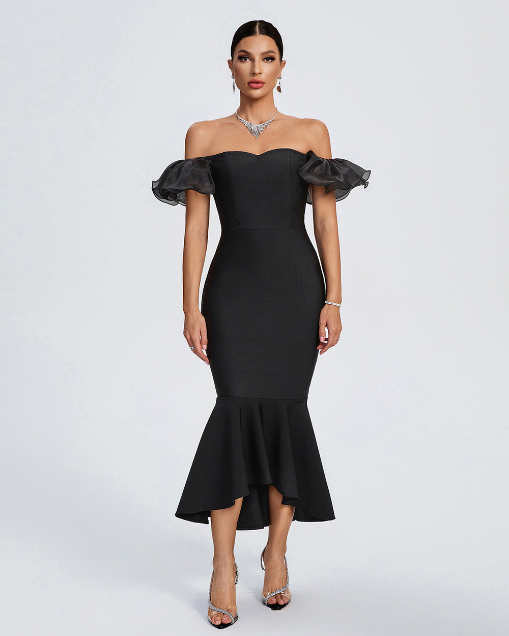 Indulge in luxury with our Off Shoulder Fishtail Bandage Dress. This sophisticated dress boasts a sleek off-shoulder design and a stunning fishtail silhouette. The black color and sleeve details add an extra touch of elegance. Elevate your evening with this exclusive and tasteful piece.