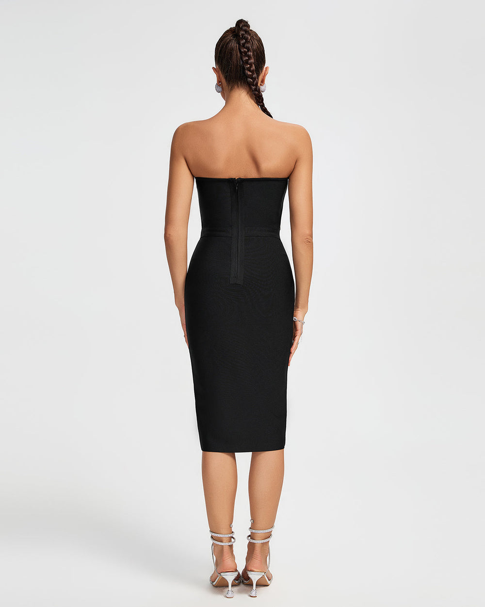 Shine bright and make a statement in our Rhinestone Bandage Bustier Midi Dress! Its dazzling design, featuring a rhinestone encrusted bandage bustier, will turn heads and boost your confidence. The perfect choice for a glamorous night out.