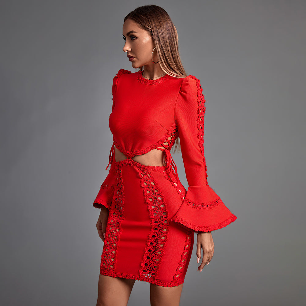 This Round Neck Long Sleeve Cut Out Mini Bandage Dress is perfect for any occasion. It features a round neck and long sleeves, with a cut-out detail for an edgy, modern look. The bandage fabric hugs and flatters your curves for a timeless and sophisticated silhouette. Be the center of attention with this unique and eye-catching piece.