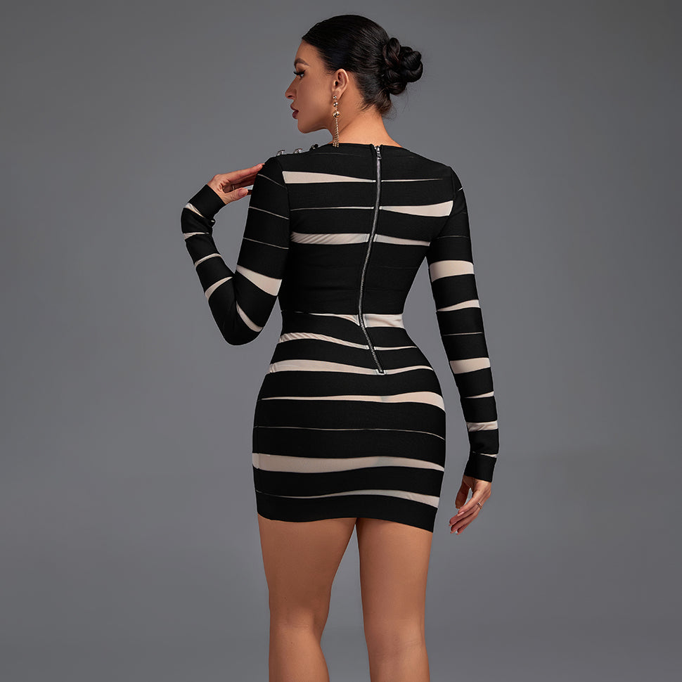 Look stylish and comfortable in this Round Neck Long Sleeve Mesh Mini Bandage Dress. Crafted with a round neckline and long sleeves, this dress offers maximum comfort and elegance. The mesh fabric creates a flattering silhouette while the bandage construction adds texture and movement. Perfect for any special occasion!