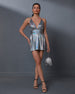 Take a chance and be the life of the party in this shimmering silver backless mini dress! From the vibrant metallic sheen to the daring silhouette, this dress is the perfect look for fearless trendsetters. Make a statement at your next event and be ready for the compliments to come!