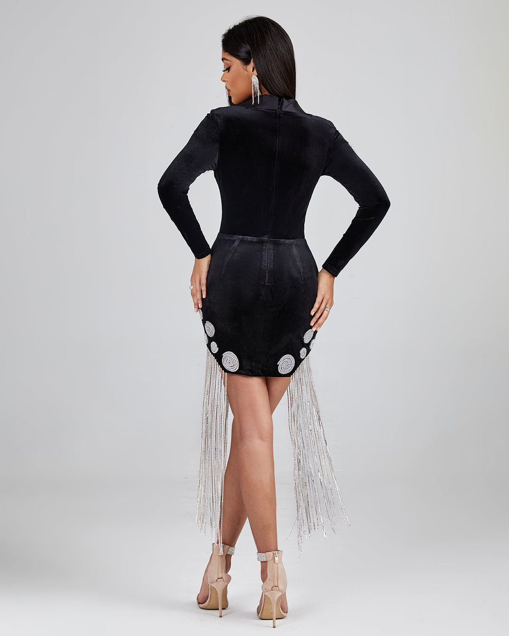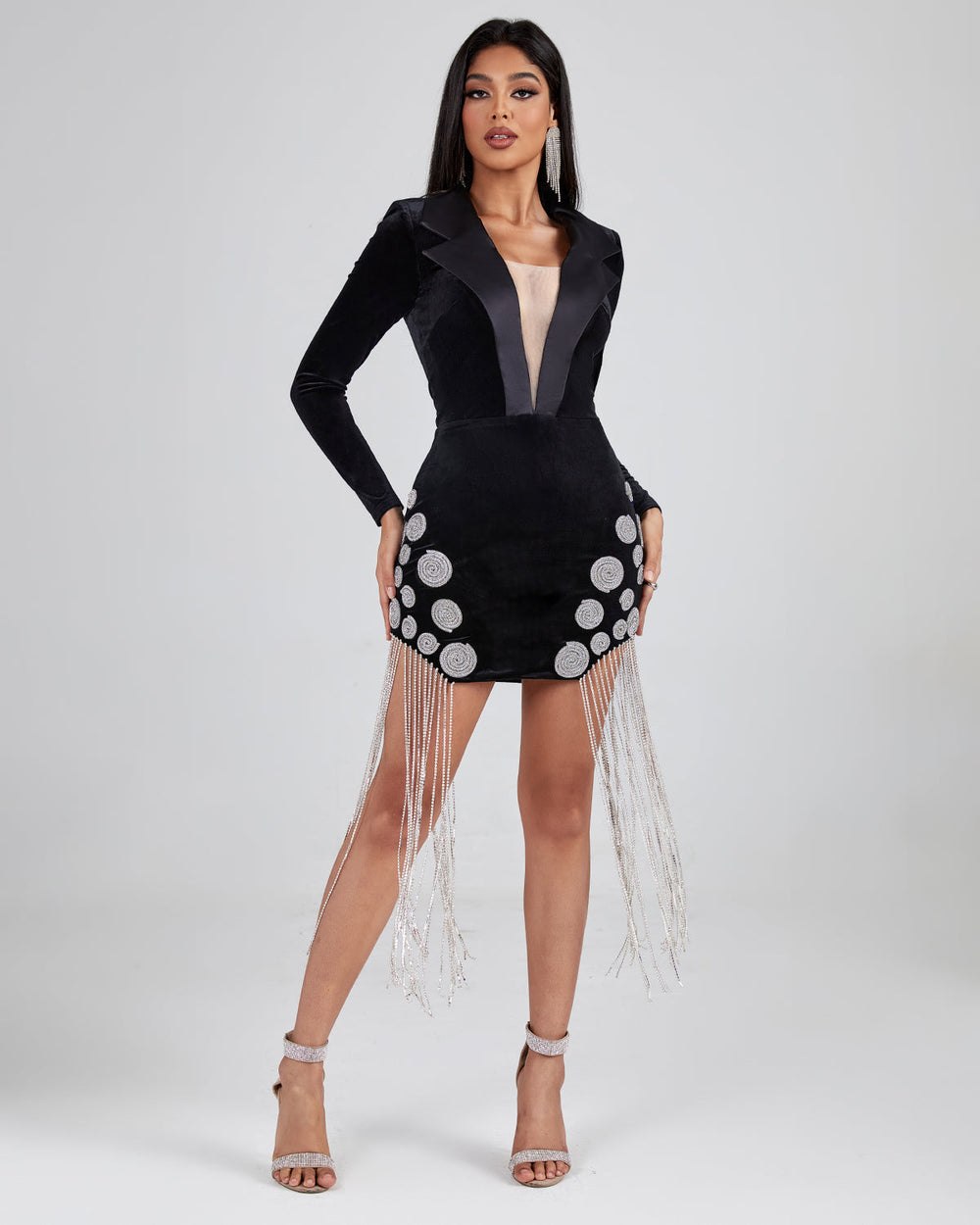 Dazzle the crowd in a head-turning ensemble with this Spiral Crystal Fringe Velvet Blazer Dress. Boasting a sleek silhouette and shimmering rhinestones, it is sure to make a statement at any event. Step out in style and grace with this luxurious dress.