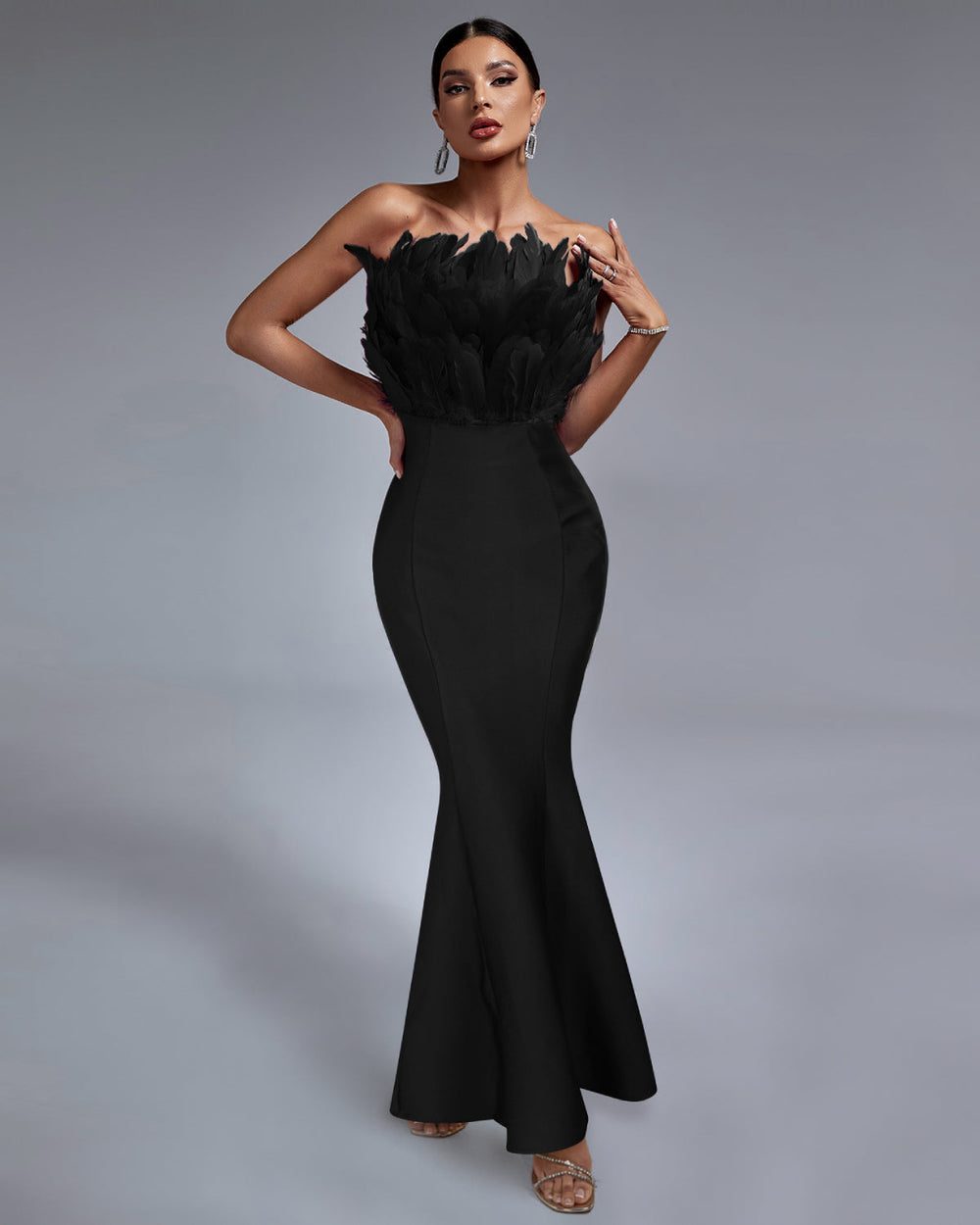 Feel elegant and exclusive in this luxurious strapless feather maxi bandage dress. Meticulously crafted with a sleek, figure-flattering fit, it features a dreamy, feather design and a pleated bandage fabric for a truly exquisite look. Perfect for special occasions, this dress is sure to make an unforgettable impression.