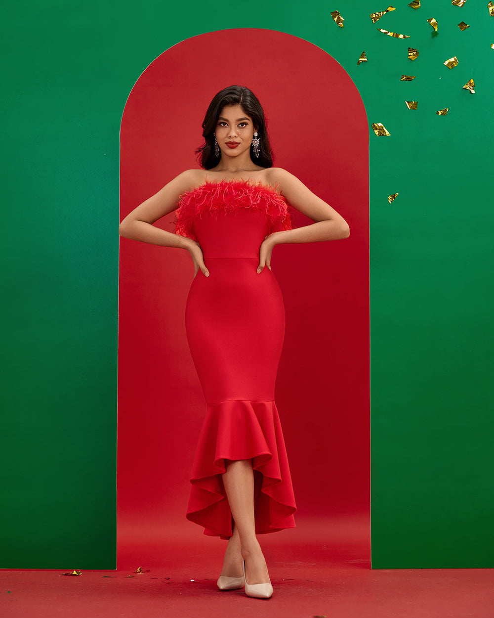Discover the beauty and luxury of our Strapless Feather Trim Bandage Fishtail Dress. This piece is crafted with exquisite detail and elegance: the strapless design features delicate feather trim, while the fishtail skirt lends sophistication and grace. The perfect statement piece for an evening out.