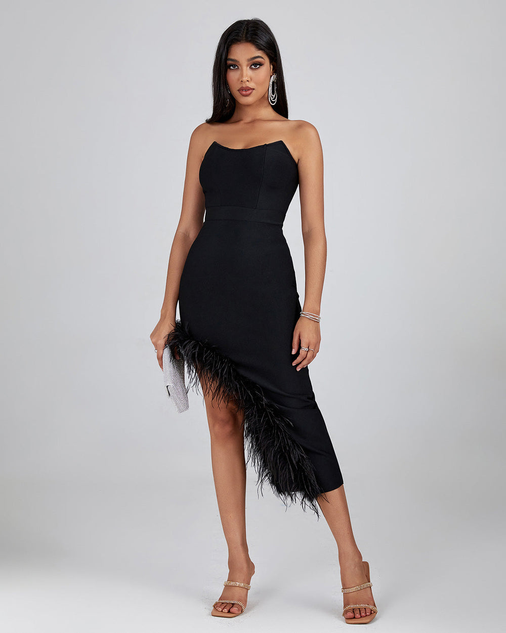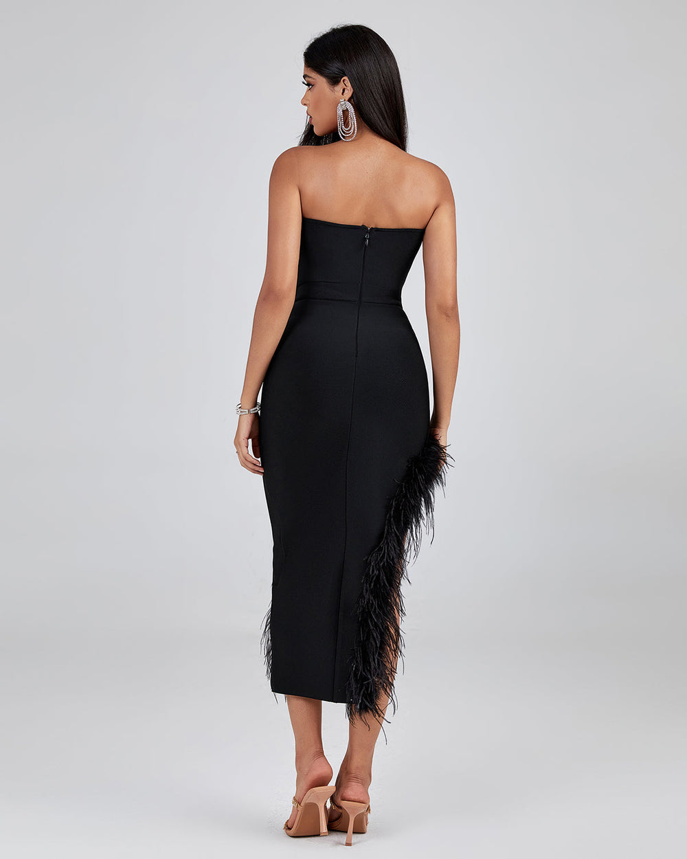 A timelessly elegant and sophisticated look, this strapless midi dress features a feather trim detail for a luxurious feel. The bandage silhouette provides a flattering fit with ease and comfort, perfect for an evening of sophistication. A dress to make a stylish statement.