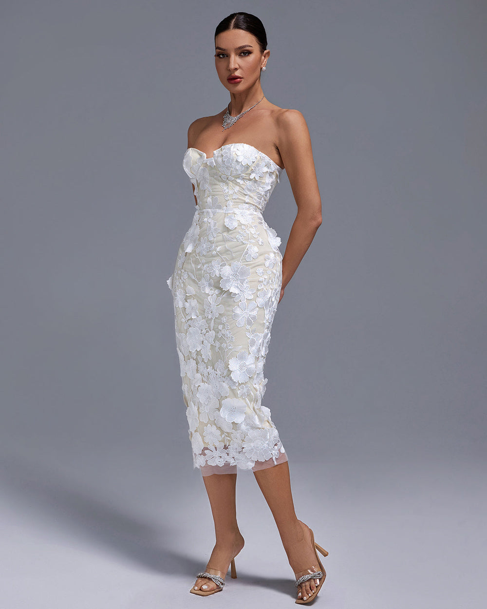 Take a daring risk with our Strapless Floral Applique Midi Dress! Featuring a stunning floral applique design and a flattering strapless neckline, this dress will make you stand out in any adventure. Embrace the challenge and add this dress to your wardrobe today!
