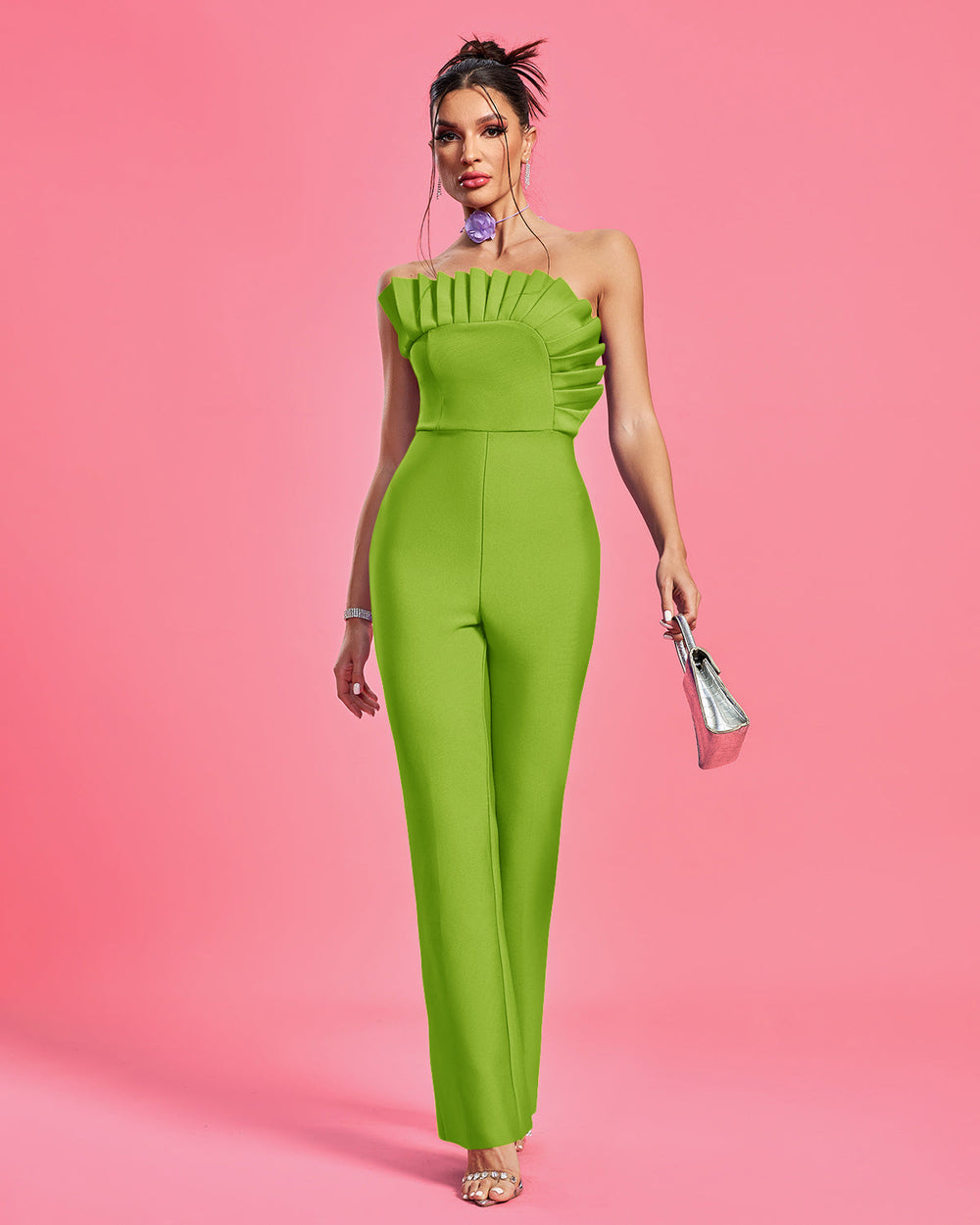 Effortlessly chic and avant-garde, our Strapless Pleated Bandage Jumpsuit boasts a flattering silhouette and intricate pleated detailing. With its strapless design and bandage fabric, this jumpsuit is perfect for any occasion. Elevate your style with this luxurious and exclusive piece.