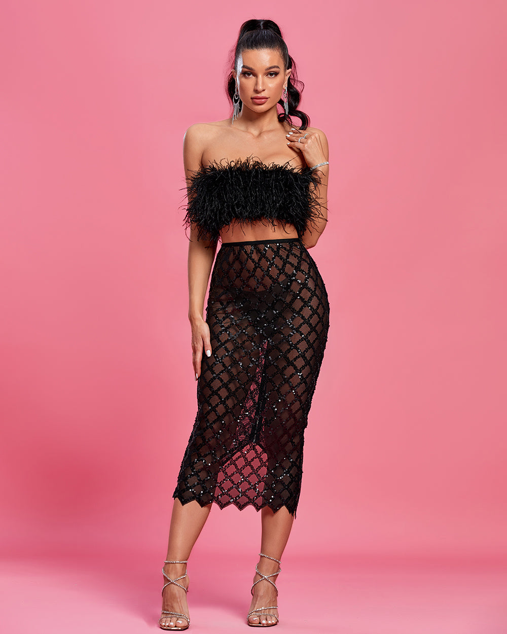 Be the star of the night in this stunning two-piece set! A shimmering sequin-embellished tulle skirt is paired with a feather crop top, creating an exquisite look that's sure to turn heads. Make an unforgettable impression - dare to sparkle!