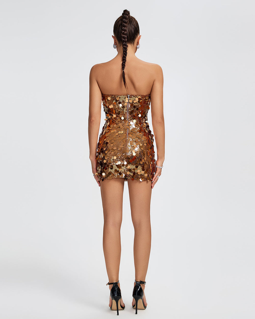 Get ready to shine and turn heads in our Open Back Sequins Embellished Mini Dress! This stunning dress features a strapless design and is adorned with sparkling sequins throughout. Perfect for a night out or special event, this dress will make you stand out and feel confident.